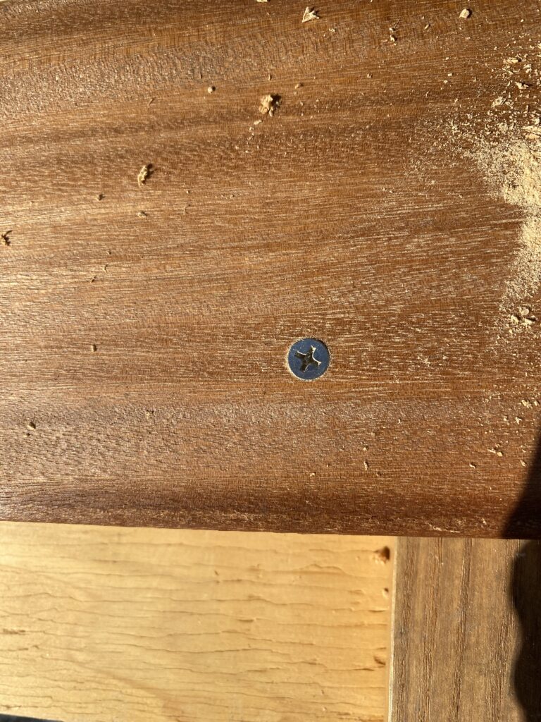 ビスの頭が材料の面と同じ(ツライチ)になるよう、あらかじめ頭が収まる溝を掘っておきます。これがプロの「納まり」の美しさです。