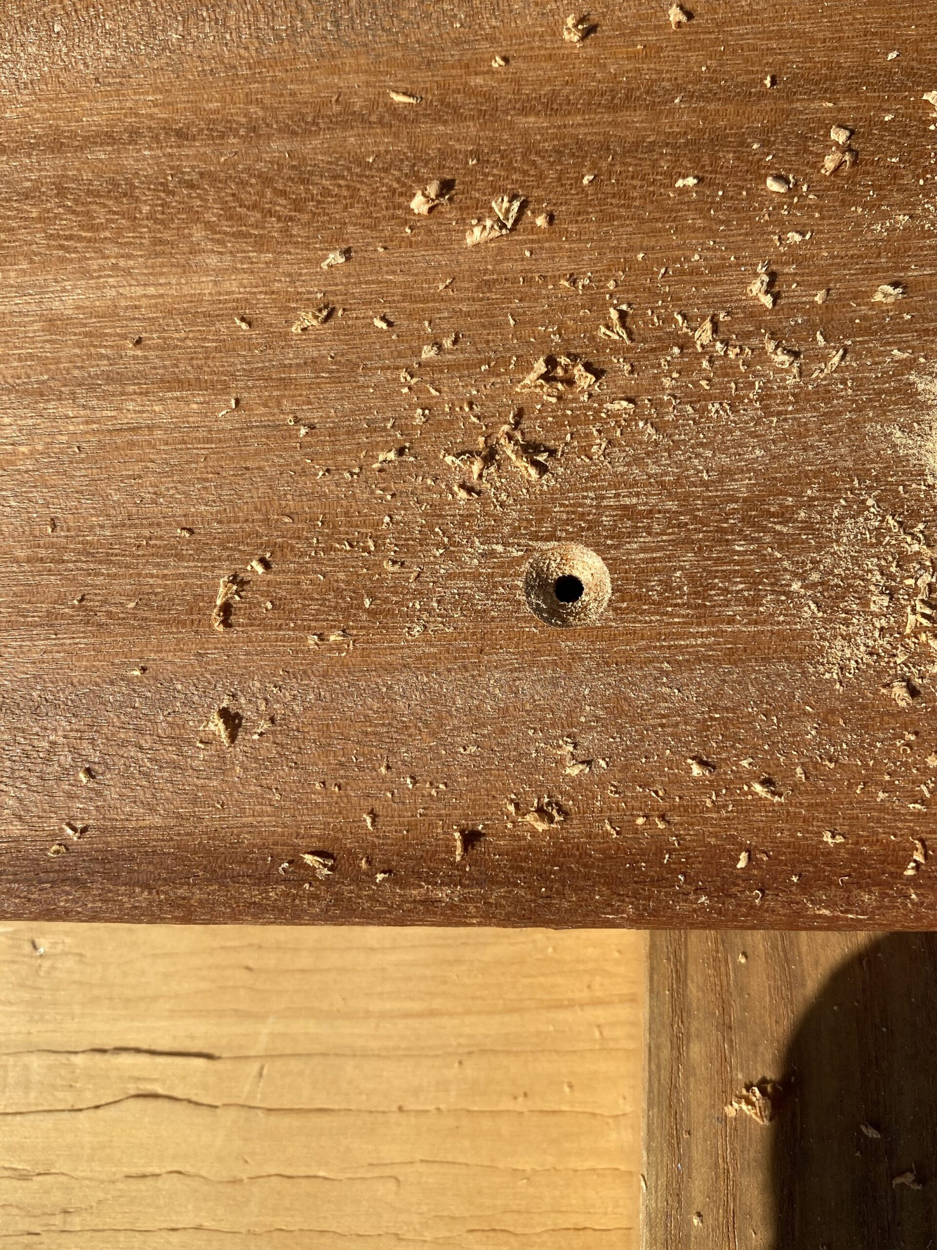 下穴と皿取、そして正しい打ち方を守れば、このように美しく、強固にビスを収めることができます。